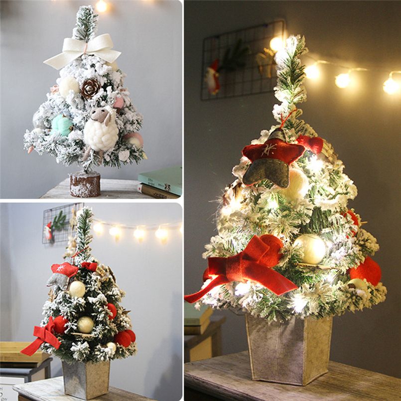 Small Christmas Tree With Multi Colored Lights On Rustic Wooden