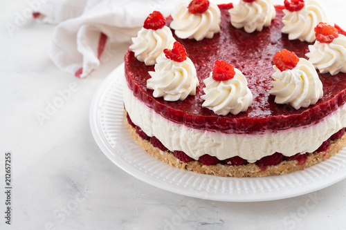 Cake With Whipped Cream And Strawberries On A Stand Close Up