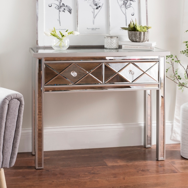 Glamorous Entry With A Mirrored Console Table Crystal Lamp And