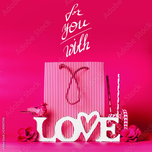 Gift Boxes Paper Cut Heart And Shopping Bag On A White Wooden