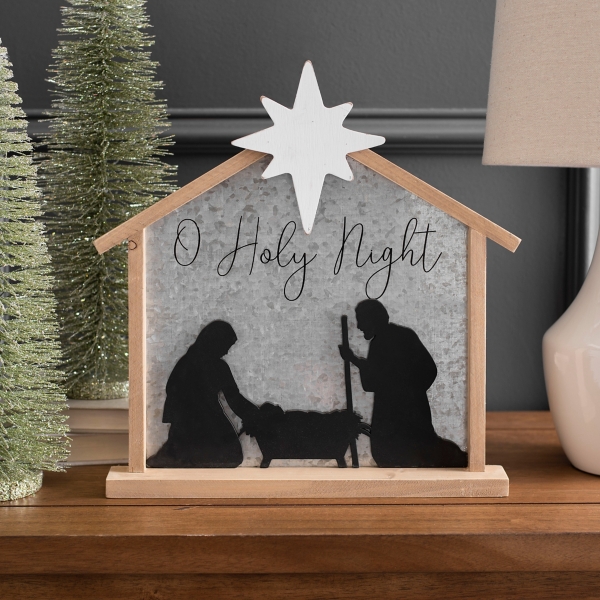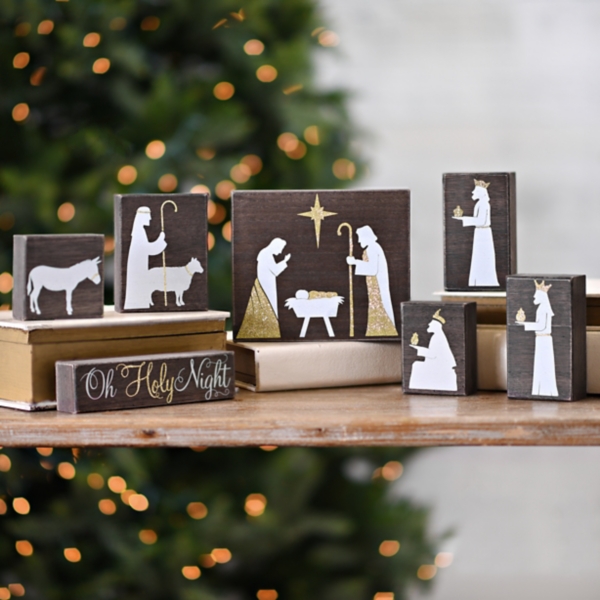 Nativity Christmas Ornaments With Decorations And Ribbon On Wood